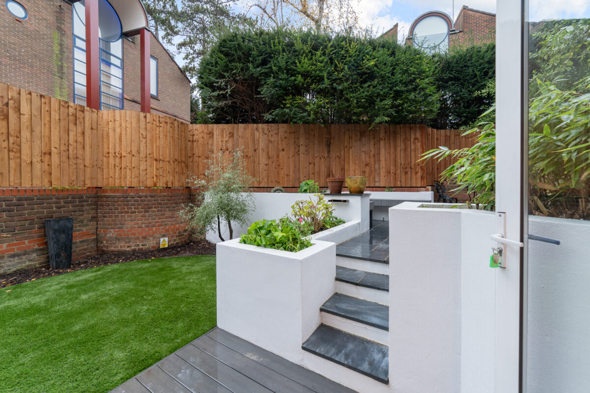 Outdoor living is enhanced by a manicured wrap-around garden with several inviting terraces, perfect for relaxation or entertaining. The inclusion of private parking further adds to the property’s appeal.